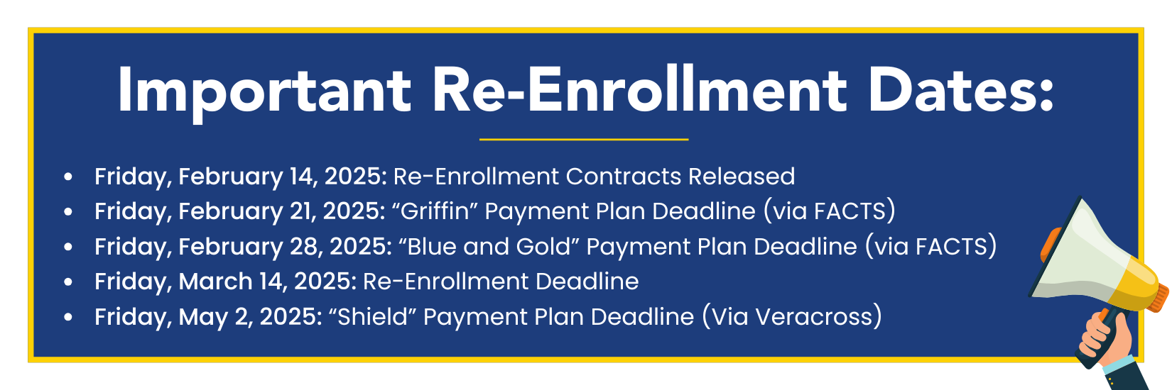 - When/how will re-enrollment take place for the 2025-2026 school year? February 14-March 14, 2025, through Veracross.